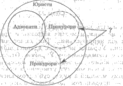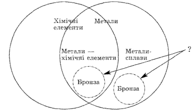 Якщо він нерозподілений, однозначно визначити відношення між крайніми термінами (тобто між, суб'єктом і предикатом висновку) неможливо. Так, у силогізмі «Всі адвокати — юристи, і прокурори — юристи; отже, прокурори є адвокатами» порушено правило щодо розподіленості середнього терміна. Середній термін повинен бути поняттям видовим щодо більшого терміна і родовим стосовно меншого терміна. У наглому ж прикладі поняття «юрист» (середній термін) є родовим стосовно більшого терміна. Про неправильність цього силогізму свідчить і графічне зображення відношення обсягів його термінів. На схемі 22 вказано лише два із багатьох можливих випадків. 3. Кожен силогізм повинен мати три, і тільки три, терміни. Порушення цього правила веде до логічної помилки, яка називається «почетверінням термінів». Ця помилка є одним із виявів порушення закону тотожності. Однією з обставин, яка сприяє припущенню подібних помилок, є багатозначність деяких слів, зокрема явище омонімії. Прикладом такої помилки може бути силогізм: «Метали — хімічні елементи. Бронза — метал. Отже, бронза — хімічний елемент». Тут під поняттям «метал» у першому засновку розуміють хімічні елементи, а в другому — сплави певних хімічних елементів. Іншими словами, роль середнього терміна тут виконує не одне і те ж поняття. Наведений приклад силогізму, в якому порушується правило щодо кількості в ньому термінів, можна зобразити за допомогою кругової схеми 23.