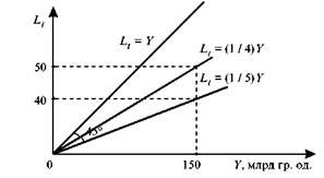 Кут нахилу лінії трансакційного попиту завжди менший за 45°, оскільки величина k на практиці набуває значення від 1/4 до 1/5.