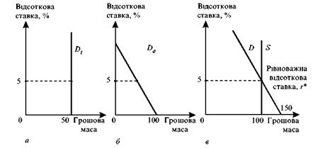 Загальний попит на гроші визначається зміщенням по горизонтальній осі прямої попиту на гроші з боку активів (рис. 8.2, б) на величину, що дорівнює попиту на гроші для угод (рис. 8.2, а).
