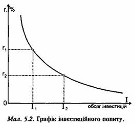 Графік інвестиційного попиту нахилений донизу (мал. 5.2): чим вища ставка процента, тим менша кіль-кість інвестиційних проектів буде прибутковою. Іншими словами, прибутковість інвестицій перебуває в оберненій залежності від ціни капіталу, і вища процентна ставка змушує фірми анулювати певні інвестиційні проекти.