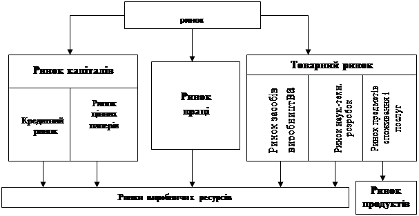Водночас, поряд із загальною структурою, слід розрізняти і конкретну структуру ринку, де виділяються ринки окремих товарів і послуг, культурних цінностей, інформації, ринки сировини і енергоносіїв, науково-технічних розробок, дитячий, молодіжний, жіночий ринок тощо, а також місцевий, регіональний, національний і світовий ринки, легальний і нелегальний ринки. Об’єктом макроекономічного дослідження є ринок національний як єдина система, а також його структурні елементи - ринок виробничих ресурсів і ринок продуктів.
