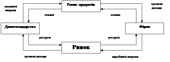 В основі макроекономічного аналізу лежить найпростіша модель кругових потоків (або модель кругообігу продуктів і доходів). В елементарній своїй формі ця модель містить лише дві категорії економічний агентів – домогосподарства та фірми – і не передбачає державного втручання в економіку, а також зв’язків із рештою країн світу (схема 2).