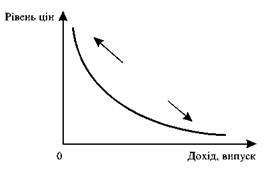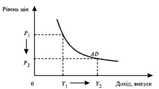 Крива AD (рис. 1) зображує зміну сукупного рівня усіх витрат домогосподарств, фірм, держави та закордону залежно від зміни рівня цін. Негативний нахил кривої AD свідчить про те, що за умови підвищення рівня цін обсяг реального ВВП, на який пред’явлено попит, буде меншим, а при зниженні рівня цін обсяг реального ВВП збільшиться.