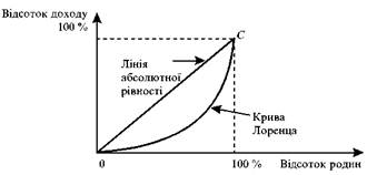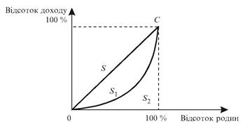 Ще один показник нерівності доходів - коефіцієнт Джині - відношення площ фігур S1, що утворюються між кривою Лоренца та лінією абсолютної рівності, та площі S, яка утворюється лінією абсолютної рівності ОС та координатною віссю (рис. 2.2).
