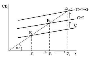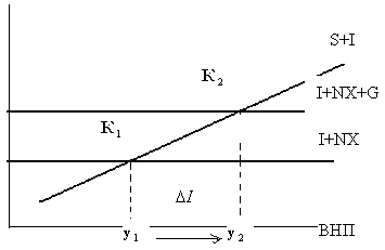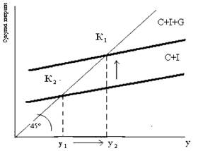 3. збільшення сукупних витрат на величину G означає, що лінія ін’єкцій переміститься вгору і де дає новий стан рівноваги ВНП в точці К2 і приріст ВНП до У2.
