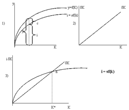 2) Графік 1- зображена виробнича функція y =f(K) та фунукція інвестицій i=S f(K) принято,що норма заощаджень (S) є постійною I = S. Отже саме норма заощаджень визначає позиція продукту на споживання (С) та інвестицій (і)