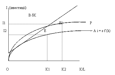 Точка Е – стаціонарний стан економіки (в точці К1), який відповідає існуючій нормі заощаджень