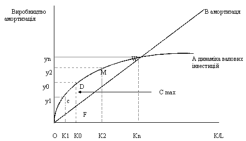 Лінія ОВ – динаміка вибуття капіталу у всіх стаціонарних точках (С,Д,M,N,) де А=ВІ=S (ВІ – валові інвестиції)