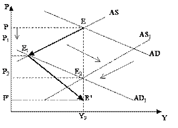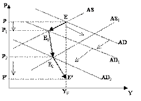 Так триватиме доти, поки ціни не знизяться до бажаного рівня (Р´)і рівновага не досягатиметься в точці Е´, при стані повної зайнятості у YF .