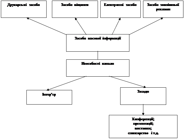 Неособисті канали маркетингових комунікацій передають звернення без особистої участі. Вони містять у собі засоби масової інформації, інтер’єри і заходи стимулювання збуту. Схематично це можна висловити таким чином (мал. 1.4.):