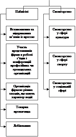 реклама, пропаганда, паблік рілейшнз, персональний продаж та стимулювання збуту, як напрямок комунікацій з точки зору соціально-психологічного аспекту будуть мати таку класифікацію, як показано на мал. 1.5. Таке твердження обумовлене єдністю природи формування складових частин даної системи. Тому маркетингові комунікації повинні розглядатися із соціально-психологічного аспекту, як похідні від комунікацій, так і з економічного аспекту, форми самостійного впливу на суб’єкти зовнішнього та внутрішнього середовища з метою формування економічно вигідного становища підприємства на ринку: керований імідж; позитивне відношення громадськості; поінформованість споживачів; сформований керований попит; розвинене стимулювання збуту та інші.