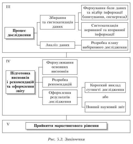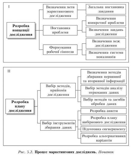 Процес маркетингових досліджень передбачає розробку докладного поетапного плану та послідовне його здійснення. Умовні етапи маркетингових досліджень схематично показано на рис. 5.2.