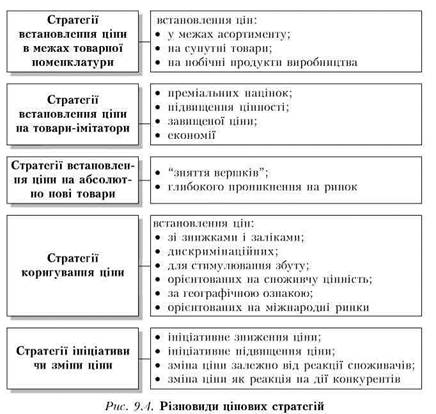 Стратегія ціноутворення змінюється, як правило, з переходом товару з одного етапу життєвого циклу на інший. Особливо відповідальним є етап виведення товару на ринок. При цьому потрібно розрізняти підходи до встановлення ціни на принципово новий товар і на товар-імітатор. Підприємство не просто встановлює єдину ціну, а створює систему цін (охоплюючи ціни на різні товари з асортименту) і коригує ціни на свою продукцію і/або послуги з огляду на витрати, попит і зовнішні фактори. Наприклад, зміна конкурентного середовища підприємства робить його або ініціатором зміни ціни, або змушує реагувати на цінові ініціативи конкурентів. Відповідно до цього розрізняють п'ять стратегій (рис. 9.4).