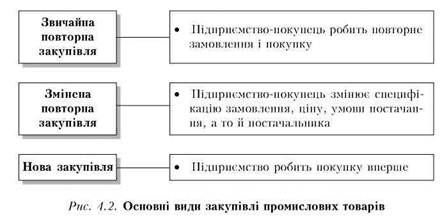 Існує три основних види закупівлі промислових товарів: звичайна повторна; змінена повторна і нова. Кожний з цих видів має певні особливості (рис. 4.2).