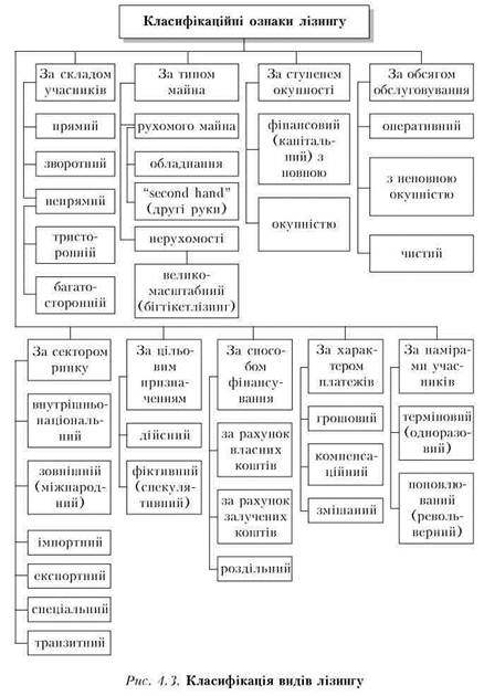 У практиці використовується багато видів лізингу (рис. 4.3) [21, с 34-35].