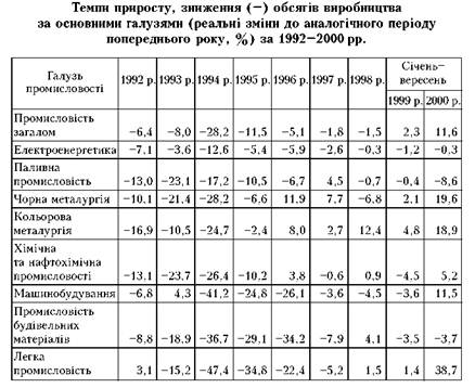 У вересні 2000 р. порівняно із серпнем обсяги виробництва продукції зменшились у таких галузях, як електроенергетика (на 1,3 %), чорна металургія (на 5,1 %), хімічна та нафтохімічна (на 6,2 %), де зосереджено близько половини загальнопромислового виробництва, а також у промисловості будівельних матеріалів (на 5,7%) та легкій (на 6,0 %).