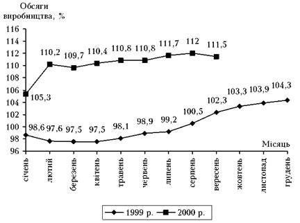 У вересні 2000 р. порівняно із серпнем обсяги виробництва продукції зменшились на 0,5 %, а порівняно з вереснем 1999 р. -збільшились на 9,2 % (рис. 2.3).
