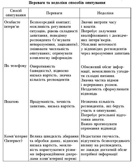 Найважливішим серед методів є опитування, яке здійснюють різними способами, що мають певні переваги і недоліки (табл. 5.3).