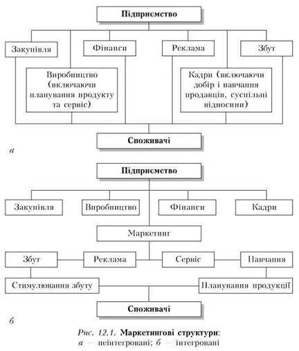 Діяльність інтегрованих маркетингових структур є комплексною, тобто вони управляються з одного координуючого центру (рис. 12.1, б).