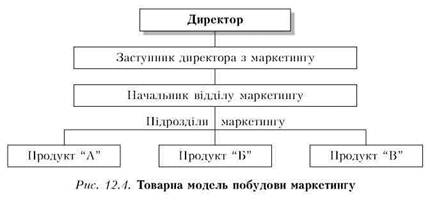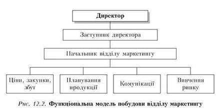 Найпоширенішою організаційною структурою відділу маркетингу є функціональна (рис. 12.2). Вона ґрунтується на підпорядкуванні спеціалістів з різних сфер маркетингу віце-президентові, який координує їх діяльність. Кількість таких функцій можна збільшувати чи зменшувати залежно від масштабів і цілей діяльності фірми. Проте якщо функцій стає надто багато, їх слід об'єднати у дві групи — ресурсні та програмно-цільові. Тоді менеджер з ресурсів управлятиме обслуговуванням покупців, рекламою, просуванням товарів на ринку і маркетинговими дослідженнями, а менеджер з програм — відповідно плануванням виробництва конкретних товарів, розширенням їх асортименту.