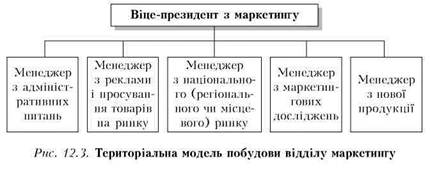 Територіальна організація повністю враховує різноманітність ринків реалізації продукції (рис. 12.3). В організаційну структуру управління входять менеджери з національного ринку. їм можуть підпорядковуватись менеджери з регіональних ринків, яким, у свою чергу, - менеджери в містах тощо. Функції менеджера з ринку схожі з функціями, які виконує менеджер, що відповідає за виробництво конкретних товарів. Він розроблює плани реалізації товарів і прибутку на ринку, організовує роботу з різними спеціалістами фірми.