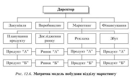 Матрична модель побудови маркетингової структури характерна для великих підприємств з диверсифікованим виробництвом і значною кількістю ринків (рис. 12.6) [5, с 244].