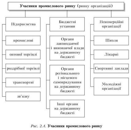 На промисловому ринку продаж і закупівля товарів виробничого призначення здійснюються здебільшого між підприємствами та організаціями, зокрема промисловими, торговельними, транспортними, будівельними, а також бюджетними установами, банками, страховими та інвестиційними компаніями, громадськими та некомерційними організаціями (рис. 2.4).