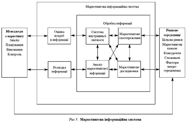 Маркетингова інформаційна система включає в себе людей, устаткування і процедури збирання, аналізу, оцінки й розподілу необхідної, своєчасної і достовірної інформації, яку використовують при прийнятті маркетингових рішень. Зміст маркетингової інформаційної системи ілюструє рис. 1.