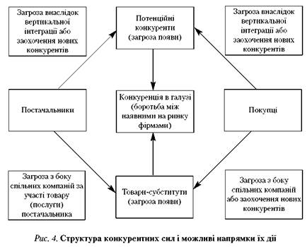 Окремі фахівці з маркетингу зводять розглянуту структуру конкуренції до трьох складових: існуючих (поточних) конкурентів, потенційних конкурентів і замінників товарів. Це пояснюється тим, що здатність споживачів іти на домовленості багато в чому залежить від того, наскільки сильна боротьба між конкурентами за поставки цим споживачам. Водночас здатність постачальника йти на домовленості залежить від того, наскільки активні споживачі в боротьбі за поставки. Отже, здатність як споживачів, так і постачальників (наприклад дистриб'юторів) іти на домовленості залежить від конкуренції на ринку. Поведінка постачальників і споживачів визначає загрозу, яка випливає від безпосередніх чи потенційних конкурентів. Тому споживачі і постачальники не є ізольованими елементами конкурентної боротьби, вони — її регулятори й стимулятори. Структуру сил конкуренції на ринку і можливі напрямки їх дії показано на рис. 4.