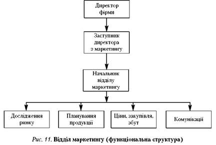 Структура функціонального типу доцільна для підприємств, які мають невелику кількість товарів і ринків. Можливий варіант функціональної побудови відділу маркетингу показано на рис. 11. Функціональна організація маркетингу базується на розподілі праці згідно з існуючими і новими функціями, на спеціалізації працівників. Якщо номенклатура продукції невелика, функціональна організація маркетингу сприяє високій маневреності завдяки простоті управління. У разі розширення номенклатури продукції, що випускається й реалізується підприємством, виробнича маневреність знижується, оскільки збільшується період реакції на зміну зовнішніх умов. Функціональну структуру маркетингу характеризує слабка гнучкість стратегії, орієнтація на досягнення поточного ефекту — вона не сприяє динамізму й новаторству.