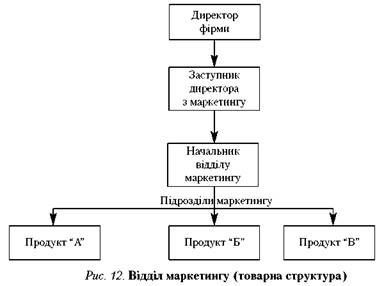 Для підприємств, які випускають велику кількість різноманітної продукції, що потребує специфічних умов виробництва й збуту, доцільною є організація маркетингу за товарним принципом (рис. 12). Така організація має певні переваги. Управляючий певним товаром координує весь комплекс маркетингу щодо цього товару і швидше реагує на проблеми, що виникають на відповідному ринку. Порівняно з функціональною товарна структура потребує більших витрат, оскільки має більшу кількість працівників. Тому найчастіше організація маркетингу за товарним принципом застосовується на великих підприємствах при значному обсягу продажу кожного товару.