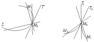 2. Задача про дотичну до кривої. З поняттям дотичної до кривої в даній точці ми зустрічалися при вивченні кола за шкільною програмою, за якою давалося означення дотичної до кола як прямої лінії, що має з колом одну спільну точку. Проте це означення є окремим випадком. Його не можна поширити, наприклад, на незамкнуті криві. Тому треба дати загальне означення дотичної, яке б підходило як до замкнутих, так і до незамкнутих кривих.