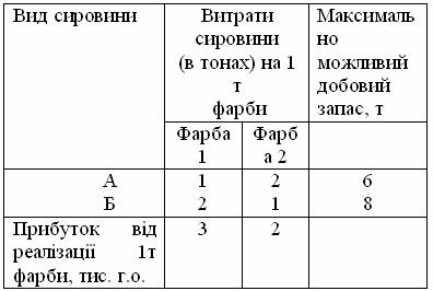 В цілому, математичну модель можна записати наступним чином. Визначити добові обсяги виробництва (x1 та x2 ) фарби 1 і фарби 2 (у тонах), такі, що забезпечать максимум сумарного прибутку: