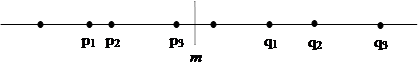Припустимо, що точка m розбиває множину S на дві підмножини S1 та S2, при чому p < q для всіх p Î S1 та q Î S2. Рекурсивним чином розв’язуємо задачу про найближчу пару для множин S1 та S2 і отримаємо дві пари точок {p1, p2} та {q1, q2}, які представляють найближчі пари для S1 та S2 відповідно. Позначимо через d найменшу відстань, знайдену на поточний момент: d = min( |p2 - p1|, |q2 - q1|). Найближчою парою у множині S буде або {p1, p2}, або {q1, q2}, або {p3, q3}, де p3 – права точка множини S1, а q3 – ліва точка множини S2 (це випливає з того, що точки p3 та q3 повинні знаходитися на відстані, яка не перевищує d від точки m).