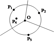 Твердження. Жодні чотири точки вихідної множини S не лежать на одному колі.