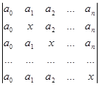 Розв’язування. Зрозуміло, що порядок визначника D дорівнює n+1 (у першому рядку n+1 елементів). Вважаємо елементи a0,a1,…,an сталими величинами, а x – змінною. Тоді кожний елемент визначника D, а тому і самий визначник, є многочленом від змінної x, тобто D= D(x). Визначимо степінь многочлена D(x). Одним з добутків, з яких складається визначник D, є добуток елементів його головної діагоналі. Цей добуток має вигляд a0xn. Кожний елемент визначника є многочленом від змінної x степеня 1 або 0. Число всіх елементів визначника, які є многочленами від x степеня 1 дорівнює n. Тому неможливо знайти добуток, який є многочленом від x степеня, більшого n. Таким чином, добуток елементів головної діагоналі визначника дає максимальний степінь змінної x, а тому D= D(x) є многочленом від x степеня n. Далі шукаємо корені цього многочлена. Якщо x = a1, то перший і другій рядки визначника рівні, а тоді визначник дорівнює нулю. Таким чином, при x = a1 многочлен D(x) дорівнює нулю. Це означає, що x = a1 – корінь многочлена D(x). Аналогічно, при x = a2 рівні перший і третій рядки визначника і D = 0, а тому x = a2 – також корінь многочлена D(x). Нарешті, при x = an співпадають перший і останній рядки визначника, а тому x = an – також корінь многочлена D(x). Ми з’ясували, що D= D(x) є многочленом степеня n від змінної x і знайшли n коренів a1,a2,…,an цього многочлена. Тому D= D(x) = a(x-a1) (x-a2)… (x-an). Залишається визначити старший коефіцієнт a. Для цього шукаємо всі добутки визначника, у яких степінь x дорівнює n. Оскільки у визначнику є лише n елементів, що є многочленами від x степеня 1, а решта елементів є многочленами степеня 0, то всі ці елементи мають бути співмножниками такого добутку. Ці елементи знаходяться на головній діагоналі і займають місця (2,2), (3,3), ., (n+1, n+1) (перше число – номер рядка, друге – номер стовпчика, у яких знаходиться елемент). За правилом будування добутків для визначника, до кожного добутку береться по одному і лише по одному елементу з кожного рядка і кожного стовпчика визначника. Тому до шуканого добутку береться також співмножник, що знаходиться у першому рядку і першому стовпчику визначника, тобто на місці (1,1). Таким чином, єдиний добуток, який дає старший степінь многочлена D(x) є добуток елементів головної діагоналі, тобто a0xn. Визначимо знак, з яким цей добуток входить до визначника. Після упорядкування добутку за першим індексом (тобто за номером рядка) другі індекси утворюють перестановку 1,2, ., n, n+1. В цій перестановці 0 інверсій, перестановка парна, знак при добутку +. Таким чином, єдиний добуток визначника, що дає максимальний степінь x, має вигляд a0xn. Тому сумарний коефіцієнт при xn дорівнює a0, тобто a = a0 і, остаточно,