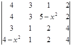 Розв’язування. Визначник D є многочленом від змінної x, тобто D= D(x). З’ясуємо степінь цього многочлена. Серед елементів визначника два елементи є многочленами від x степеня 2, решта елементів – многочлени степеня 0. Зрозуміло, що максимальний степінь змінної x можна одержати лише в добутках, серед співмножників яких є два многочлена степеня 2. Таки добутки існують, наприклад, добуток елементів побічної діагоналі. Добуток елементів побічної діагоналі має вигляд 2×(5-x2)×1×(4-x2) = 2(5-x2)(4-x2), тобто є многочленом від x степеня 4. Таким чином, степінь многочлена D= D(x) дорівнює 4. Знаходимо корені цього многочлена. Неважко бачити, що перший і другий рядки співпадають, якщо 5-x2 =1. Звідси x2 = 4, x = ± 2. Таким чином, при x = 2 і x = -2 визначник дорівнює нулю, а тому x1 = 2 і x2 = -2 – корені многочлена D(x). Аналогічно, третій і четвертий рядки визначника співпадають, якщо 4-x2 = 3. Звідси x2 = 1, x = ± 1. Таким чином, x3 = 1 і x4 = -1. – також корені D(x). Для многочлена D(x) степеня 4 відомі корені x1 = 2, x2 = -2, x3 = 1 x4 = -1. Звідси D(x) = a(x-2)(x+2)(x-1)(x+1) = a(x2-4)( x2-1), де a – старший коефіцієнт. Для знаходження числа a шукаємо всі добутки, яки є многочленами від x степеня 4. Як сказано вище, співмножниками такого добутку є многочлени 5-x2 і 4-x2, тобто елементи визначника, що стоять на місцях (2,3) и (4,1). За правилом будування добутків для визначника, до такого добутку входять співмножники, що знаходяться або на місцях (1,2) і (3,4), або на місцях (1,4) и (3,2). Таким чином, існують два добутки, яки є многочленами степеня 4. Перший добуток має вигляд d1= 3×(5-x2)×4×(4-x2) = 12(x4-9x2+20) = 12x4-108x2+240; другий добуток d2= 2×(5-x2)×1×(4-x2) = 2(x4-9x2+20) = 2x4-18x2+40. З’ясуємо знаки, з якими ці добутки входять до визначника. До добутку d1 входять елементи, що стоять на місцях (1,2), (2,3), (3,4), (4,1). Після упорядкування співмножників за першим індексом другі індекси утворюють перестановку 2, 3, 4, 1. В цій перестановці 3 інверсії, перестановка непарна, знак при добутку ‑. До добутку d2 входять елементи, що знаходяться на місцях (1,4), (2,3), (3,2), (4,1). Після упорядкування співмножників за першим індексом другі індекси утворюють перестановку 4, 3, 2, 1. В перестановці 6 інверсій, перестановка парна, знак при добутку +. Знайдемо сумарний коефіцієнт при x4 в добутках d1 і d2. У добутку d1 коефіцієнт при x4 дорівнює 12, знак при добутку ‑, у добутку d2. коефіцієнт при x4 дорівнює 2, знак при добутку +. Тому сумарний коефіцієнт при x4: a = -12+2=-10, а тому,