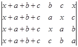 = 0, тобто при x = -a-b-c, перший стовпчик визначника нульовий, а тому D= 0. Це означає, що x1 = -a-b-c – корінь многочлена D(x). Далі повернемось до початкового визначника, додамо до першого стовпчика другій стовпчик і віднімемо суму третього і четвертого: