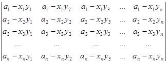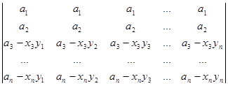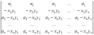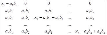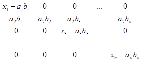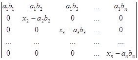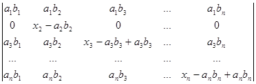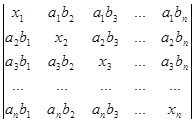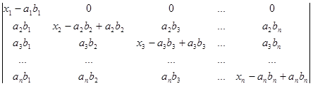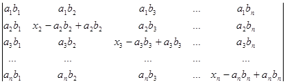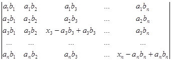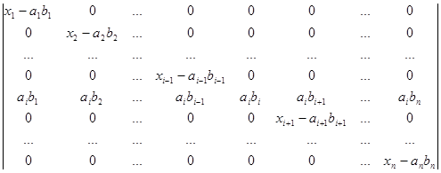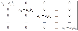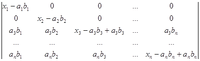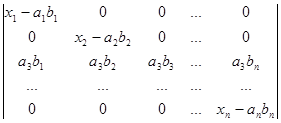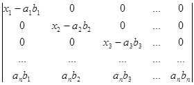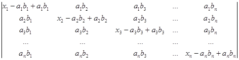 Рядки, в суму яких розкладається даний рядок початкового визначника, поділимо на два типи. Рядками першого типу будемо вважати рядки (a1b1,a1b2, a1b3,…, a1bn), (a2b1,a2b2, a2b3,…, a2bn), (a3b1, a3b2, a3b3,…, a3bn), ., (anb1,anb2, anb3,…, anbn). Рядки другого типу – це рядки (x1-a1b1,0, 0,…, 0), (0,x2-a2b2,0,…, 0), (0,0,x3-a3b3,…, 0), ., (0,0,0,…, xn-anbn). Після розкладу визначника в суму послідовно за всіма рядками одержуємо суму визначників, які мають лише рядки першого та другого типів. Неважко переконатись в тому, що рядки першого типу пропорційні. Тому визначник, який має принаймні два рядки першого типу, дорівнює нулю. Для того, щоб знайти величину визначника D, достатньо взяти лишу суму ненульових визначників. У кожному з таких визначників не більше одного рядка першого типу. Якщо визначник не має рядків першого типу, то всі його рядки другого типу і визначник має вигляд
