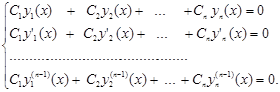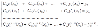 Дійсно, оскільки система розв’язків лінійно незалежна, то визначник Вронського відмінний від нуля й алгебраїчна система неоднорідних рівнянь