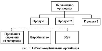 Якщо в процесі обробки одного об'єкта об'єднуються різні види діяльності, то здійснюється об'єктно-орієнтована організація (рис. 3).