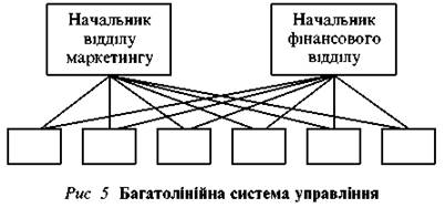 За багатолінійної системи управління кожна посада може підпорядковуватись кільком вищим (щонайменше двом) (рис. 5). Розпорядча влада розподіляється між кількома посадами з правом прийняття рішення. Переваги багатолінійної системи управління полягають у спеціалізації та меншій порівняно з однолінійною системою управління забюрократизованості.