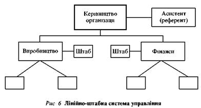 Ця система об'єднує переваги одно- та багатолінійної систем управління (рис. 6). Вона є однолінійною, але в ній використовуються переваги спеціалізації через організацію штабів (допоміжних підрозділів, що підтримують інстанції, але не мають дисциплінарної влади).