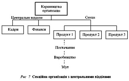 Секційна організація є об'єктно-орієнтованою організаційною системою, розподіленою за продуктами, споживчими групами чи регіонами. Така організація виникає переважно за високої диверсифікації виробництва. Окрім секцій часто створюють функціонально-орієнтовані центральні відділи: фінансовий, кадрів, постачання та ін. (рис. 7).
