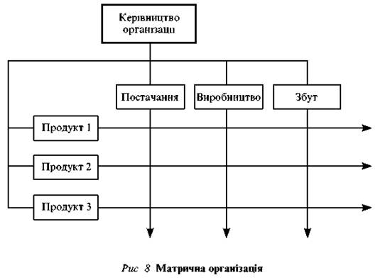Матрична організація поєднує принципи функціональної та об'єктно-орієнтованої систем. Тут вертикальна, функціонально-орієнтована структура "пронизана" горизонтальною, об'єктно-орієнтованою, тобто перетинаються дві системи повноважень: "що" та "коли" — по горизонталі і "як" — по вертикалі (рис. 8). Це зумовлює недоліки матричної системи, оскільки авторитетом і повноваженнями наділені два різних керівники. Конкуренція між ними може гальмувати процес прийняття рішень. Матрична організація висуває високі вимоги до дисципліни та здатності співробітників до інтеграції. Водночас вона може бути швидко адаптована до конкретної ситуації, що особливо важливо на багатопрофільному виробництві.