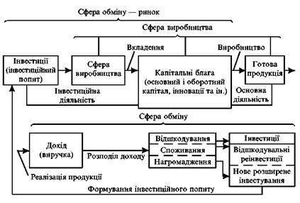В умовах високого рівня розвитку продуктивних сил, постійного поглиблення поділу праці, що зумовлює підвищення її ефективності, істотно зменшується потреба створення (будівництва, виробництва) інвестиційних товарів для організації власного виробничого процесу. Звичайно, необхідні товари і послуги купуються на ринках інвестиційних товарів. Отже, в сучасних умовах інвестиційна діяльність відбувається переважно у сфері обміну і виражається у формі купівлі-продажу товарів і послуг на ринках інвестиційних товарів. Виходить, для ринкової економіки замкнутий на підприємство кругообіг інвестицій так само нехарактерний, як і замкнений обіг продукту і доходу.