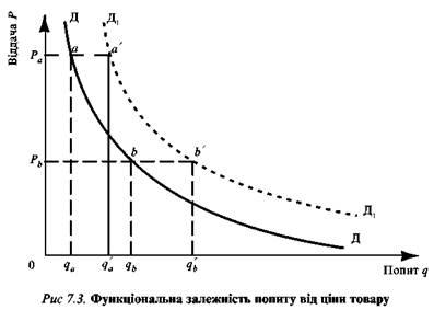 Математично залежність попиту на товар описується кривою попиту Ρ =f(q), де Ρ — ціна одиниці товару; q — кількість одиниць товару, що купується упродовж певного періоду. Приклад такої функції наведено на рис. 7.3.