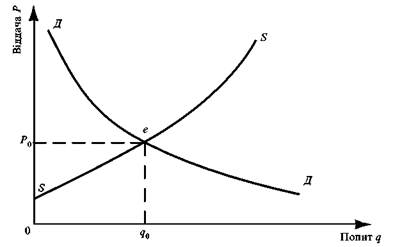 Хоча прагнення покупця і продавця, їх реакція на збільшення (або зменшення) ціни різні, акт купівлі-продажу не відбудеться, доки не встановиться взаємоприйнятна ціна, яку звичайно називають рівноважною, тому що вона врівноважує попит і пропозицію. Графічно така ціна відповідає точці перетину кривих попиту і пропозиції (рис. 7.4). Перетин кривої пропозиції товару SS із кривою його попиту ДД визначає рівноважну ринкову ціну товару.