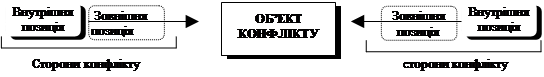 Як видно з схеми, в об'єктивній конфліктній ситуації присутні об'єкт конфлікту - реальний або ідеальний предмет, що є причиною суперечки і сторони конфлікту або його учасники, як які можуть виступати окремі люди або групи людей. Для сторін характерна наявність у них зовнішньої і внутрішньої позиції в конфлікті. Зовнішня позиція - це те мотивування участі в конфлікті, яке відкрито пред'являється сторонами своїм опонентам (так частіше за все називаються учасники конфліктної взаємодії). Вона може співпадати, а може і не співпадати з внутрішньою позицією, що є набором тих істинних інтересів, мотивів і цінностей, які примушують людину або групу включатися в конфлікт. Відзначимо, що внутрішня позиція часто прихована не тільки від опонентів і спостерігачів, але і від самого суб'єкта, оскільки є неусвідомлюваною.