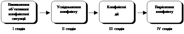 Таким чином, конфлікт виникає з появою об'єктивної суперечності в цілях і інтересах учасників, стає для них психологічною реальністю після усвідомлення суперечності в реальному інциденті, проходить стадію конфліктних дій і приходить до певного дозволу.